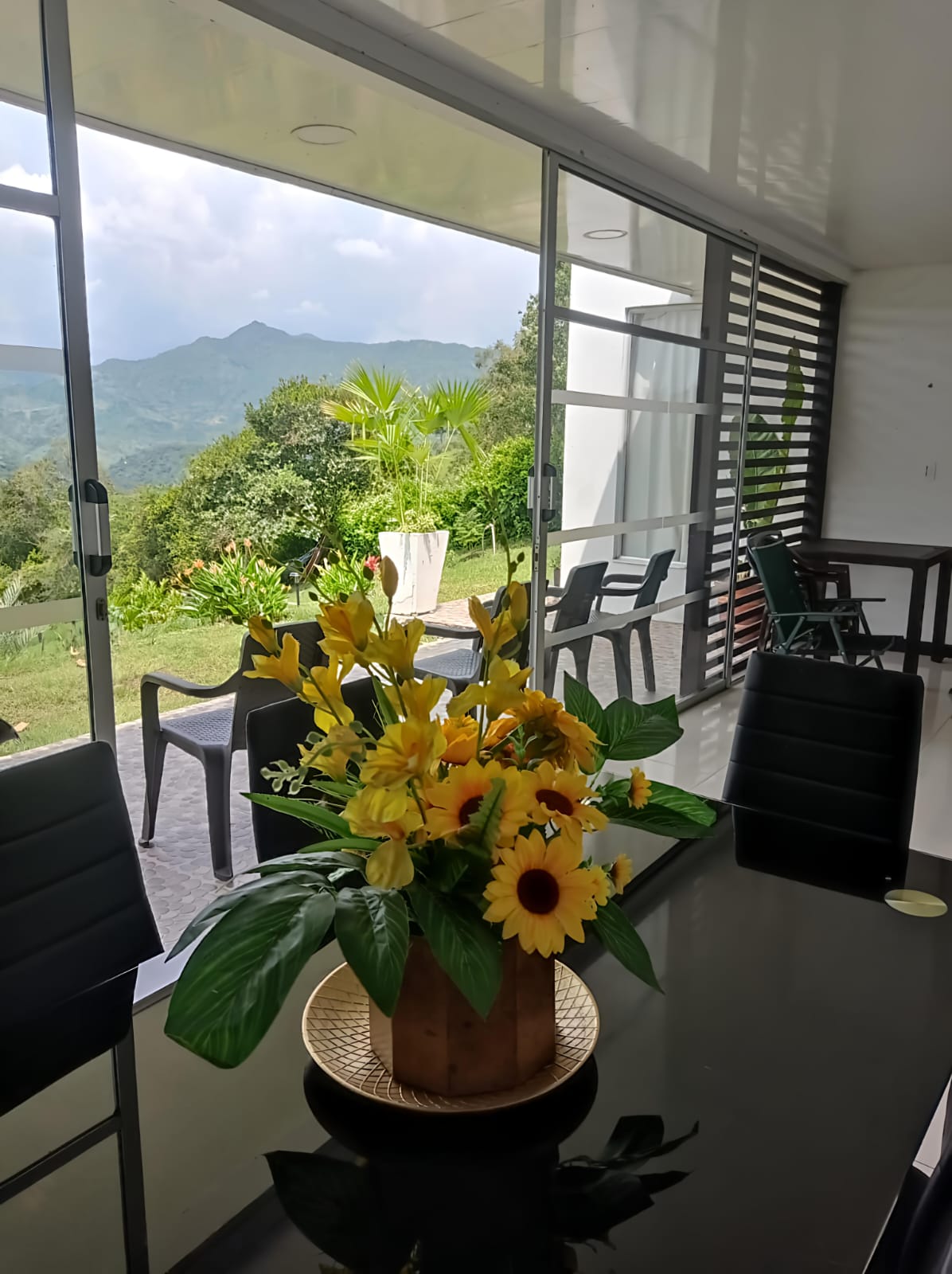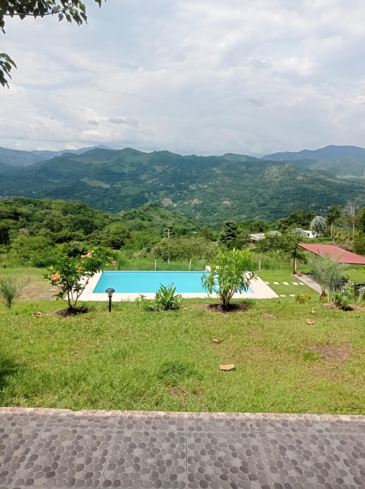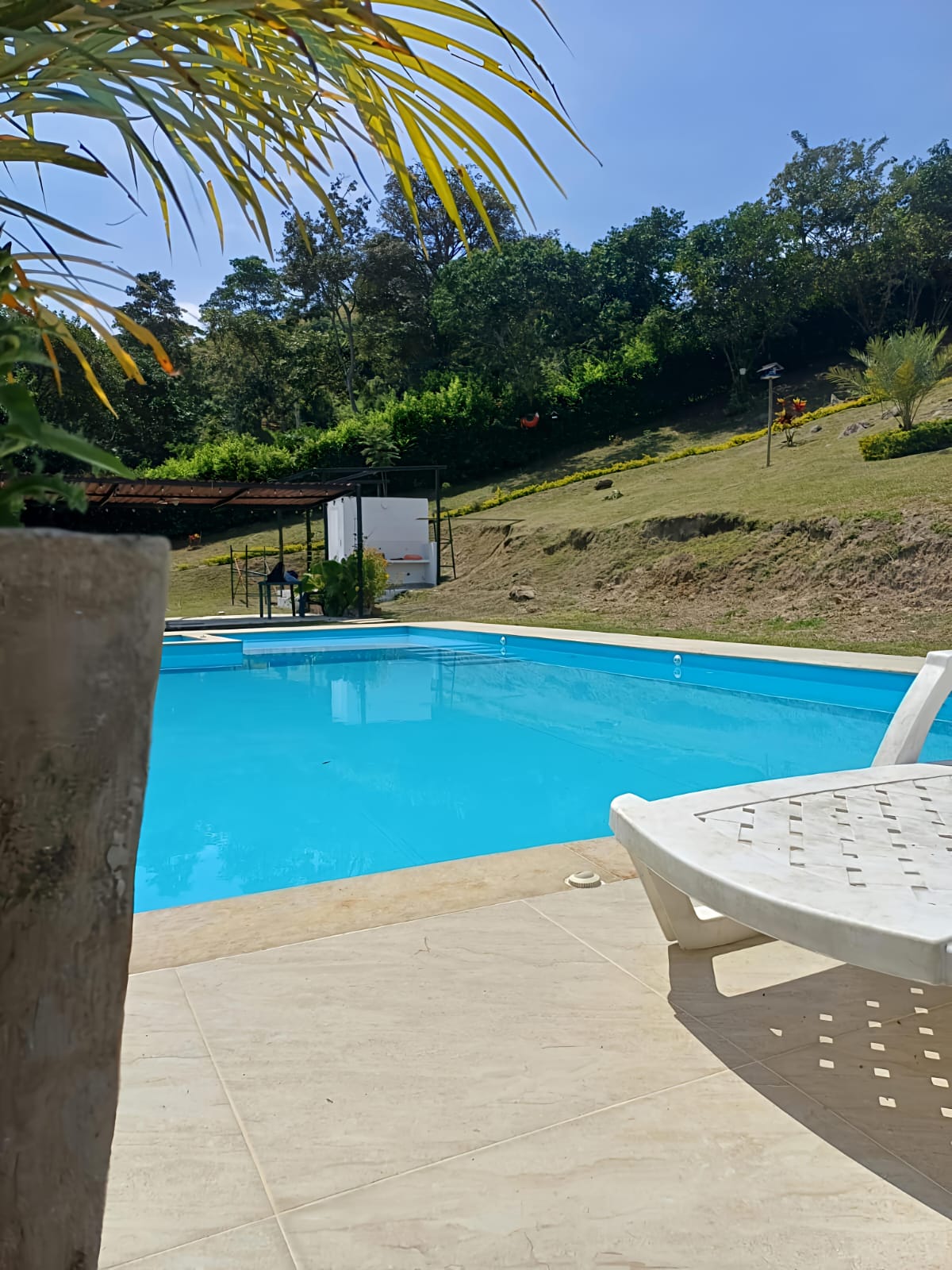 En el área exterior podrás disfrutar de una piscina grande y hermosa, acompañada de un kiosco amplio donde podrás sentarte a descansar, conversar o comer mientras contemplas los paisajes espectaculares y las zonas verdes llenas de naturaleza que rodean la finca.